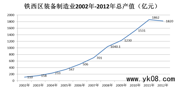 单就铁西区而言,从2002年到2012年,铁西区地区生产总值从104.9亿元增长到1105亿元,规模以上工业总产值从231.7亿元增长为2630亿元,社会消费品总额也从58亿元增长为441亿元。