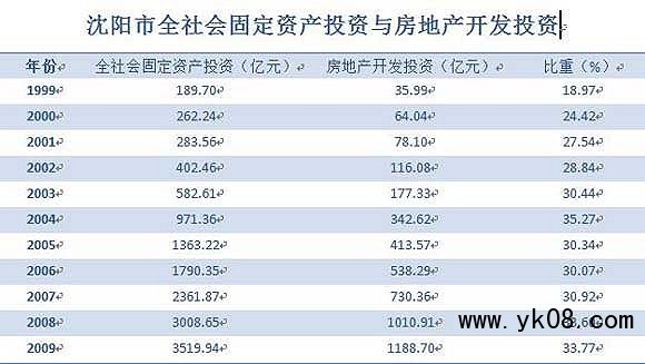 辽宁社科院经济所前所长陈萍对1999年至2009年间沈阳市房地产数据进行分析。数据显示,2004年至2009年间,无论是商品房价格还是住宅价格,都是以两位数的年均增长率上升。从增长速度看,1999年至2009年,全社会固定资产投资年均增长33.92%,同期房地产投资年均增长41.87%,房地产开发投资的年增长速度明显超过固定资产投资的增速,从而使房地产开发投资在固定资产投资中所占的比重提高至1/3。