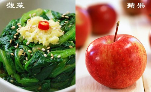 菠菜及苹果都是含叶酸的食物,叶酸可降低冠心病和中风发病率。(网络图片)