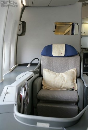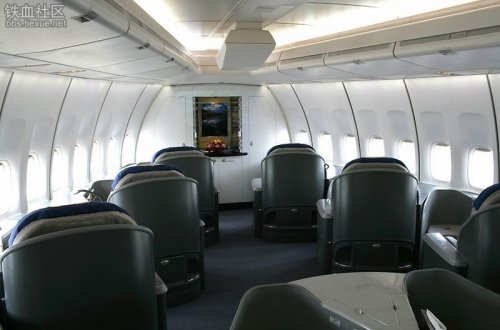 前舱即习近平乘坐的舱段。它位于驾驶舱正下方的下层客舱前端,安置有10个可135°半平躺的座椅,呈鱼骨状排列。其座椅部置也会根据需要进行调整,但基本不会像大家想象中的那样豪华,基本相当于商务客舱的水平。当然,前舱也会有些小惊喜,比如备份机B-2471的机舱隔断上就被画上了一幅国画。画面是颐和园昆明湖的景色。
