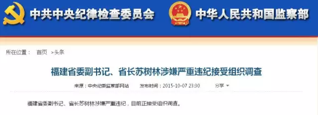 9月26日,老王结束在福建的三天考察回京。过了11天,国庆黄金周还没算过完,10月7日晚11时30分,中央纪委官网突然发出消息:福建省委副书记、省长苏树林涉嫌严重违纪,目前正接受组织调查。